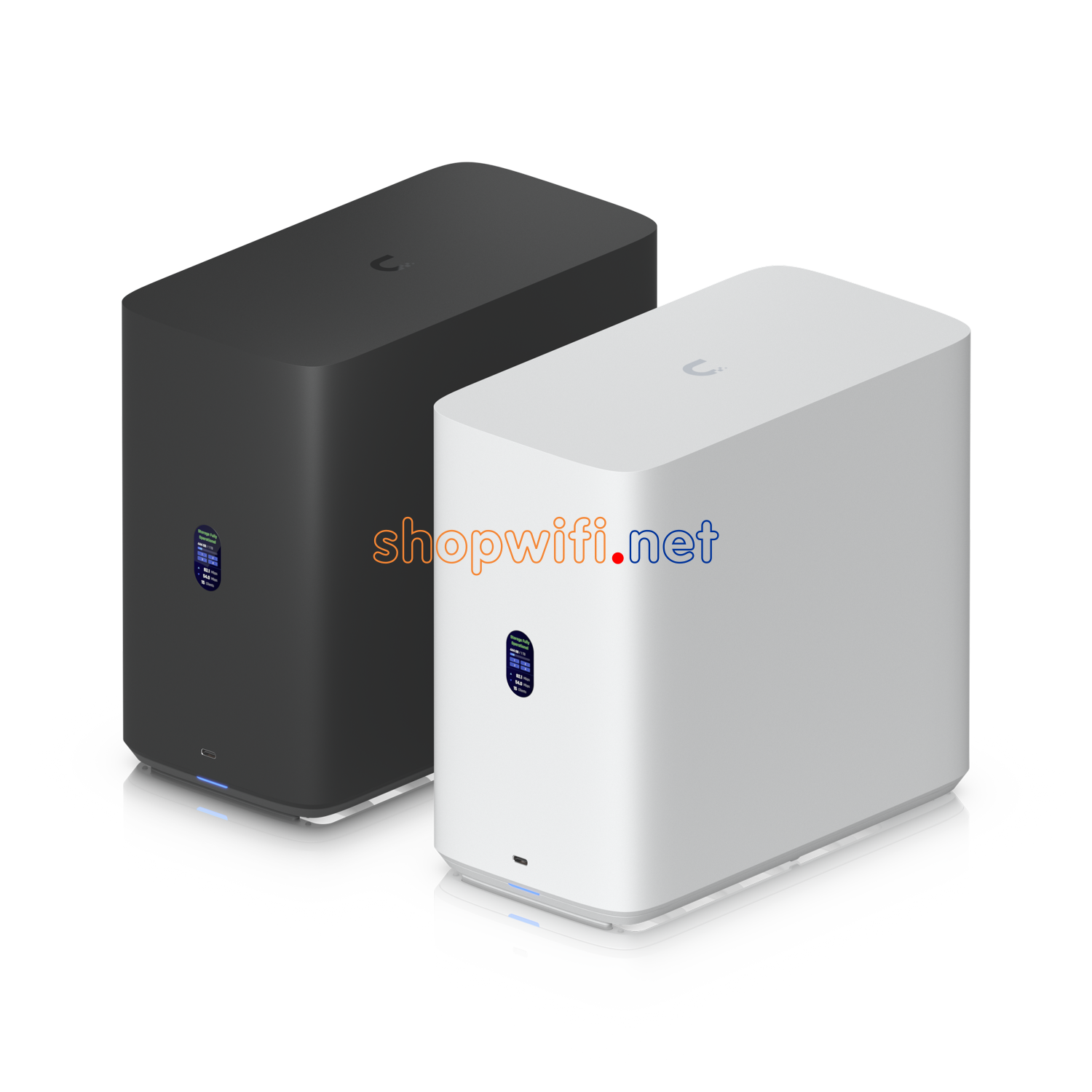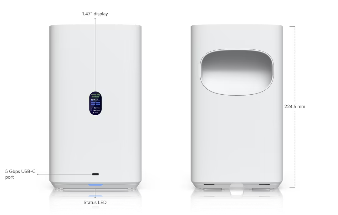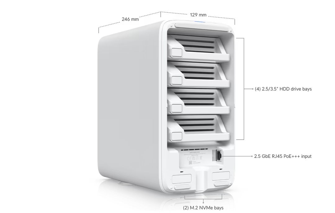 UniFi Network Attached Storage with (4) 2.5/3.5″ HDD bays, (2) M.2 NVMe SSD cache slots, 2.5 GbE networking, USB-C connectivity, and an included PoE+++ adapter, all in a compact footprint.